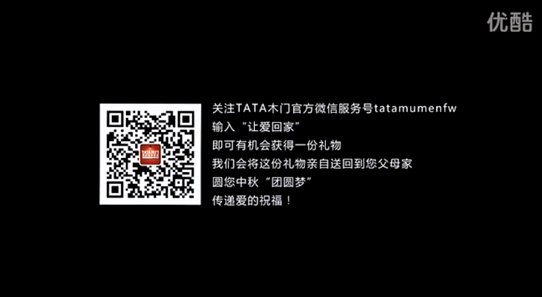 视频最后透漏,TATA木门“致中秋,让爱回家”活动还在进行中,回不了家,但是“爱”一定要回家。提示只要关注TATA木门官方微信服务号,输入“让爱回家”就可能有机会为父母赢取一份“心愿礼物”,小编也要去参与了!