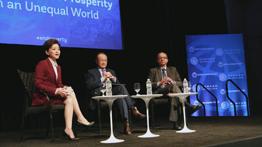 世行年会受到了广泛关注,中国网友在微博上针对今年的议题提出许多问题,杨澜女士选择了其中一个向金墉和巴苏发问:“缩小贫富差距谈了很多年,但感觉差距越来越大。今后二三十年会怎样?”两位给出的回答是:“发达国家和发展中国家的贫富差距在明显缩小, 86个国家中有58个实现了收入最低的40%人口的收入増长速度超过人均GDP增长速度,意味着在这些国家贫富差距正在缩小。”杨澜还提到,中国的经济正在进行结构性的调整,进行转型和升级,主要影响的是低端劳动力市场,这会对收入较低的工薪阶层带来较大的冲击。对此,巴苏认为,中国的低端劳动力受到的冲击是短暂的痛苦。同时,他希望通过加强劳动力的技术培训,让他们适应更高附加值的工作。