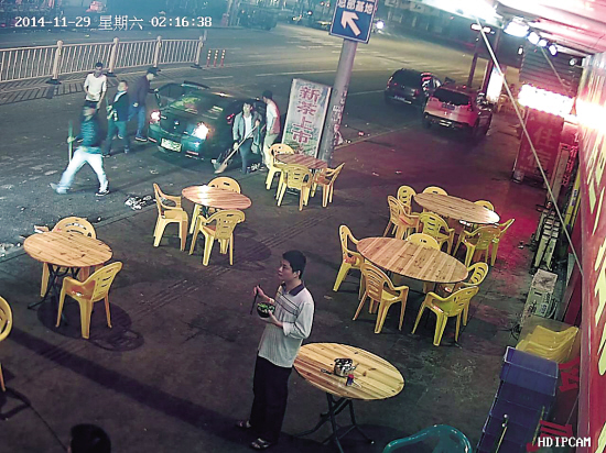 整个过程持续了将近一分钟,社会青年行凶后坐上等候的轿车扬长而去,消失在夜色中。