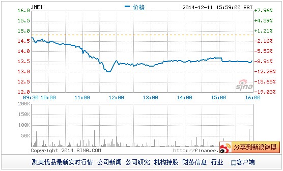 聚美此次股价下跌,势头正是从Q3财报发布开始,Q3数据显示,第三季度总净营收为1.577亿美元,比去年同期的1.233亿美元增长28.0%;归属于公司普通股股东的净利润为1950万美元,比去年同期的1030万美元增长88.6%,这是聚美优品连续十个季度盈利。