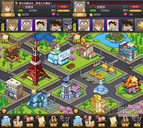 在游戏的主界面上,我们可以看到很多与养成、挑战、抽卡相对应的建筑物,这些建筑界面被称为“米花市”,有原作中出现的建筑场景有着千丝万缕的联系,这些建筑有的可以升级,有的则仅是单纯的功能性建筑。