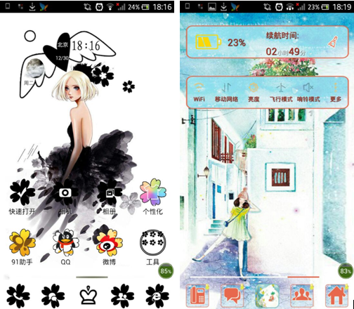 91桌面的个性混搭功能,打破了传统桌面美化软件固有的特定图标、背景、字体、滑屏、指尖特效统一捆绑为不可改变的主题美化模式,将各主题元素进行拆分,你不仅可以根据自己的需要随意进行图标和动态壁纸更换,还能够随心搭配组合手机的个性字体、炫动铃音等,自由混搭的玩法让你的个性创意主张能够得到更加淋漓尽致的发挥。当清新简约的田园风主题邂逅复古文艺的中国风图标,强烈的风格冲撞让你从里到外实现彻底的个性展现,轻易HOLD住小伙伴眼球。