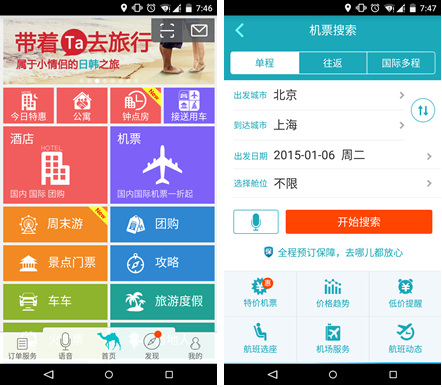 “去哪儿旅行”支持手机直接购买国内超过3000条航线的特价机票,同时还支持各大酒店、宾馆和景点门票的预定。同时还支持在线预定从机场到市内的班车,让我们体验到“一条龙”的回家体验。
