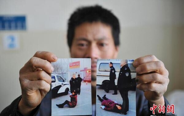 “面包车上坐了4个民警,我、爱人、儿子及两名工友5个人,被拉到派出所院里。”王友志称,妻子当时动弹不得,是被硬塞进车里的,“我看不对劲儿,问了妻子一句,就被一名民警扇了一耳光。”随后,他们5人分别被关进不同的房间内,他们对我拳打脚踢,事后,自己被检查得知6根肋骨断裂。