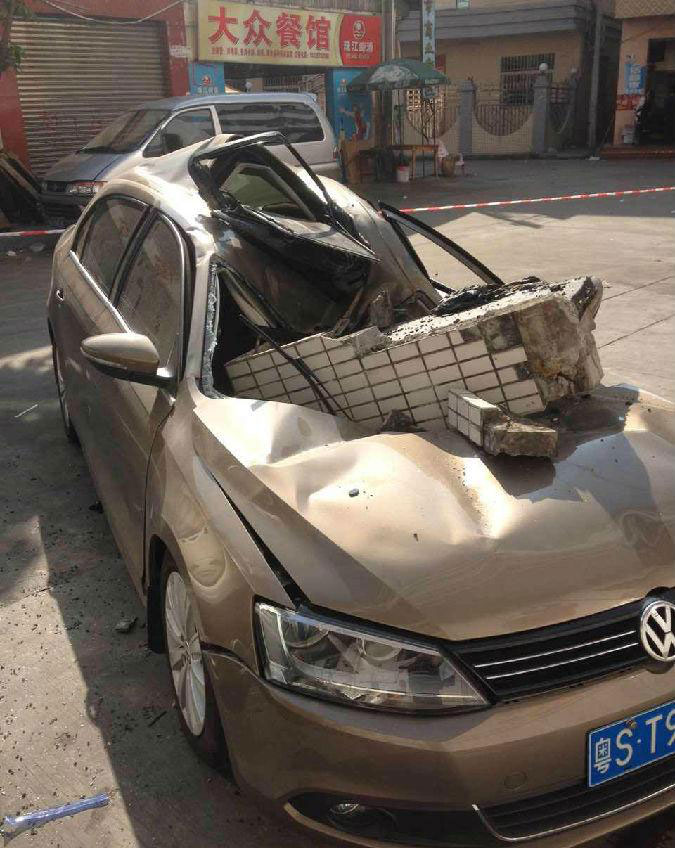事发在南城蛤地钱屋前村牌楼处的一栋七层楼楼下。当时这辆东莞牌照的大众速腾小车停靠在该楼背面一块空地上。据大楼背后斜对面的一家士多店老板说,前日中午11点半左右,他正在店中准备午饭。“忽然门外传来‘轰隆’一声巨响”,士多店老板说,起初他以为发生爆炸,赶紧跑出店门,就看到这辆速腾小车车顶被一段墙壁彻底压垮,“好在当时车里并没有人。”