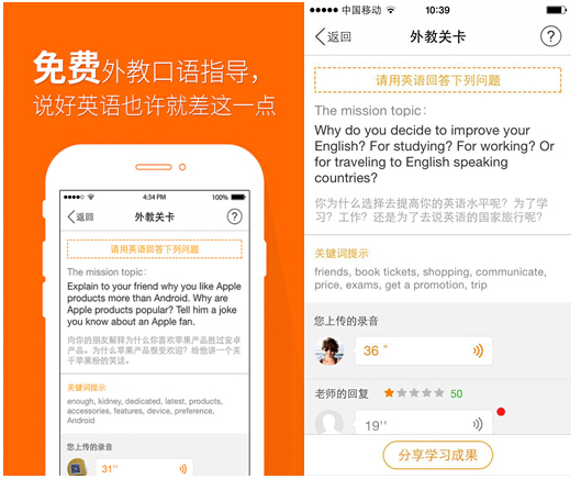 经过测试,多说英语操作上比较流畅,尤其是外教指导的关卡像微信一样便利,用户可录一段1-2分钟的语音发出去,就能迅速收到真人外教的文字指导和语音指导。“这个功能让用户不需要专门预约并腾出上课时间,能够让用户更充分自由地利用他们的碎片化时间。单纯靠手机练口语的APP无法做到外教指导,多说英语更有针对性,更符合个人的英语水平。”51Talk相关负责人说道。