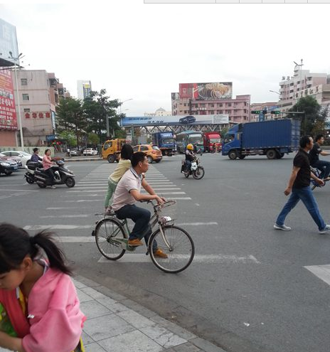 有市民报料,昨天下午在黄江镇公常路与莞樟路交汇的十字路口等候绿灯时,发现身边一位像是父亲的中年男子骑自行车载着几岁的女儿。