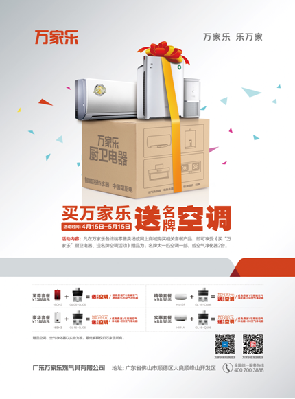 为感谢全国用户的支持和信赖,4月15日至5月15日期间,万家乐推出《买万家乐厨卫电器 送名牌变频空调》“五一”大型优惠活动。只要消费者选购指定产品套餐即可有名牌变频空调、空气净化器两件套或万家乐3000元橱柜代金券相送。