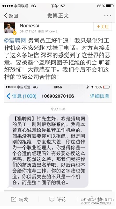 其事情的经过是这样的: 猎聘网一名服务人员向一位姓钟的先生通过电话推荐职业机会。但可能此时钟先生正在忙,说其暂不考虑就挂断了。之后,猎聘网员工通过系统给钟先生发了一条这样的短信,钟先生将内容晒到了微博上,内容如下: