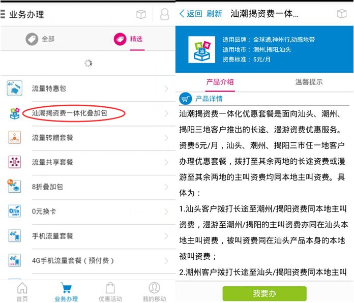 据了解,广东移动用户可登陆广东移动10086掌上服务厅,在业务办理中即可选择汕潮揭资费一体化叠加包。