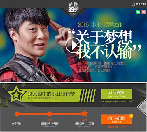 近日,首批“偶像众筹”成果——5组歌手、5张风格各异的EP已全面上线。其中歌手小水的经历尤其让人意想不到,其先是在主播平台上模仿童声翻唱《捉泥鳅》的视频萌翻网友,播放量冲破8000万。再次,通过粉丝成功众筹,在各音乐网站推出单曲,制作人甚至请来了小虎队、张雨生的金牌制作人陈秀男!