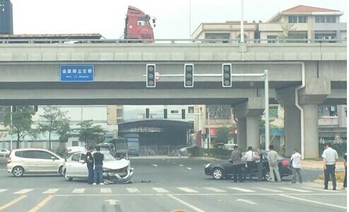 今天上午,在松山湖大道往东莞方向市篮球中心路段发生一则严重交通事故。在该路段红绿灯处,两小轿车由于“不礼让”狠狠地撞在一起,事故并没导致人员伤亡。
