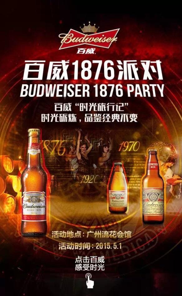 百威,要做啤酒界的坚守大师。你想感受吗?穿越时空,重新回味这段坚守之路,百威时光旅行记1876派对将于5月1日晚上,在广州流花会馆举行活动,为你展示不同年代的百威酒吧风情,狂野而文艺,浪漫又动感,让你有机会与上千名百威粉丝聚首齐欢、高歌热舞,再次品尝百威啤酒那不变的品质口感。