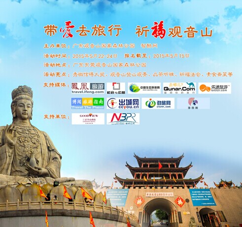 “带爱去旅行 祈福观音山”、“粤游粤开心 粤游粤有福”,活动诚邀广东本省及周边省市旅游爱好者、环保及公益等领域人士参加。让我们为爱相约观音山!有关“带爱去旅行 祈福观音山”活动更多详细信息,请访问活动专题页面:http://www.zhkoo.com/zhuanti.aspx