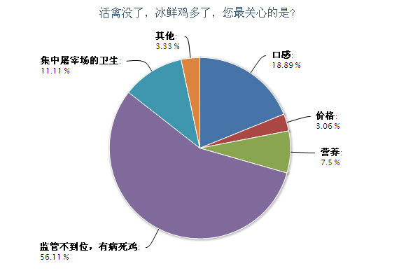 活禽集中屠宰后,生鲜鸡将进入餐桌,不少网友在留言中表示,最担心的并不是口感和营养。受访网友表示,商家在销售冰鲜鸡与冷冻鸡时,应该标明品牌、品种、生产日期等。有网友留言说最担心三个问题,一是产品质量,会不会和病死鸡混在一起买,或者销售即将病死的鸡;二是生鲜日期;三是否回收生鲜鸡,重新贴标签后再流出市场。超过56%(202名)受访网友担心病死鸡,对监管并不是很有信心。