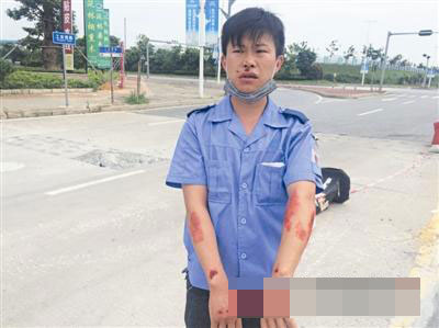 赵先生磕断一颗门牙,双手也多处擦伤。沈十全/摄