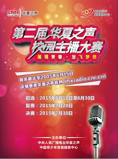 2015年,“华夏之声校园主播大赛”再度重磅来袭,心怀主播梦想的年轻人们参赛热情不断高涨。大赛珍视每一位年轻人的梦想和追梦之旅,力求搭建最好的平台让他们光芒四射, 决赛现场将产生“华夏之声校园主播大赛”金银铜、特别奖及“华夏之声十佳校园主播奖”。十佳校园主播赛后赴中央人民广播电台京、广、深编辑部实习,担任《high青春》节目校园记者,作为嘉宾出现在栏目中分享自己的参赛经历。金银铜及特别奖在华夏之声、香港之声招聘中同等条件下优先录取。梦想绚烂绽放,展现青春,放飞梦想,让我们一起期待,今年华夏大地的青春“华丽蝶变”!