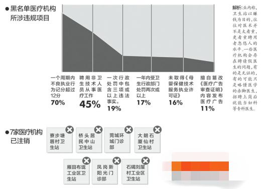 去年1月1日起,东莞开始实施“违法违规执业医疗机构公示制度”,并明确将13种违法违规行为纳入“黑名单”予以公示。记者对“黑名单”上现有的81家医疗机构统计发现,有50 .6%的违法违规执业行为都发生在卫生站,其次为门诊,医院以及诊所为个位数。