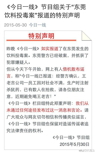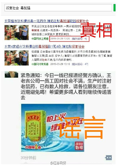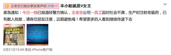 与肯德基流传已久的“六翅怪鸡”谣言不同,王老吉谣言则利用了社会热点事件捏造事实。5月30日下午,一条谣言在微信朋友圈迅速传播:“《今日一线》已报道,经警方确认,王老吉公司一员工因对社会不满,生产时注射杀鼠药,已有数人抢救,请各位朋友注意,近期避免喝。”其将前一天东莞警方侦破的一起在东莞四家商店内人为向软包装饮料注射投毒事件,恶意歪曲为王老吉公司员工投毒。