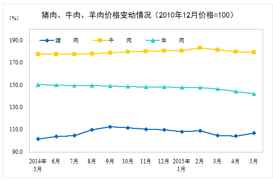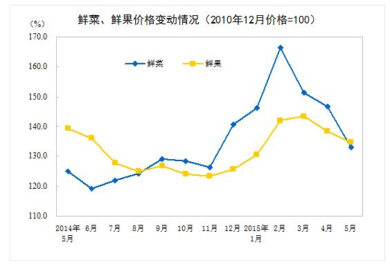2015年5月份,全国居民消费价格总水平同比上涨1.2%。其中,城市上涨1.3%,农村上涨1.0%;食品价格上涨1.6%,非食品价格上涨1.0%;消费品价格上涨0.9%,服务价格上涨2.1%。1-5月平均,全国居民消费价格总水平比去年同期上涨1.3%。