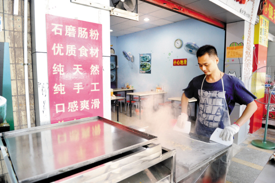 虽然只是一间普通的肠粉店,但对早餐店内的每件事情,梁伟明都要追求高品质。每天他只准备30多斤的大米磨浆,当天用不完的所有材料,情愿浪费倒掉也绝不留到第二天使用,“因为这样做出来的肠粉不够新鲜好吃。”担心市民吃肠粉时口感太干,他还准备大米粥、小米粥、豆浆,甚至是柠檬水等让顾客自由搭配。(记者 单辉强)(来源:羊城晚报)