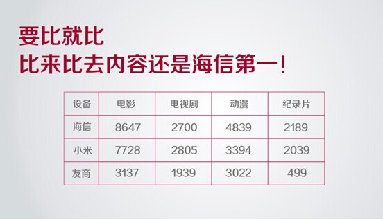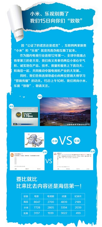 海信称:“作为国内电视行业国内连续12年第一、全球中高端占有率第三的老大哥,我们有义务奉劝两位小弟心平气和、诚实地在产品、技术、质量和服务上下真功夫,和海信一起,共同推动中国电视机产业的大发展。”最后海信还不忘自黑一下,称“会有选择地虚心向两位营销大师学习‘营销传播’的功夫。”并约好15日上午10时,用实际行动向小米和乐视“致敬”。