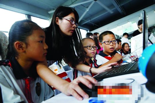 6月17日上午,东莞首届创客梦想汇在天安数码城科技成果交易中心起航,小创客们体验玩转成语故事。 方光明/摄
