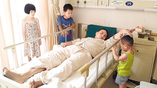 2日,记者来到刘伟的病房,其60多岁的父亲和三个小孩围在床边。躺在病床上的刘伟告诉记者,因为腰椎骨裂,其大部分时间都是躺在病床上,如果要下床走动,则需要有人搀扶慢慢移动。事发后,海昌码头的老板支付5000元医药费后,就对他置之不理。而因为拖欠药费,医院目前已经停止用药。而让刘伟顾虑的是,他作为家庭的顶梁柱,希望可以先养好伤打工挣钱养家。如今他躺在病床上,谁来挣钱抚养三个孩子让他陷入了沉思。