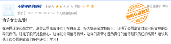 在股民迷茫恐慌之时,康美公司高管许女士挺身而出,投大额资金增持股份,证明了公司高管对自己所管理的公司的自信,稳定了股民持股信心。这样的公司值得信赖,这样的高管才是负责任的值得股民信任的高管!在当下的这种环境下,我们需要更多康美药业、许冬谨这样的女士共同承担起企业责任,和广告股民一起共赴难关,体现企业价值!