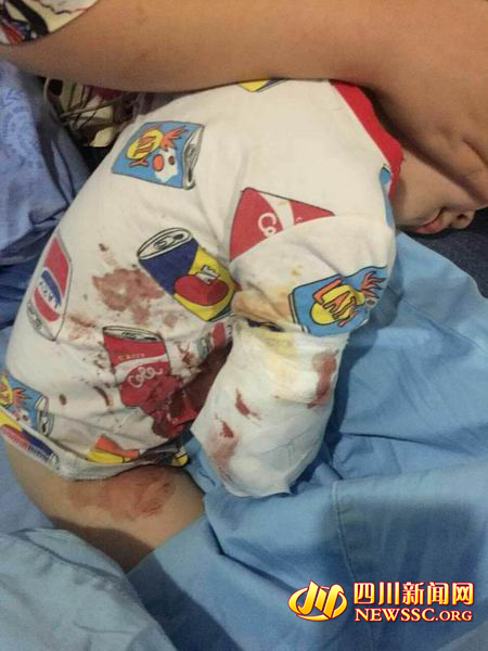 男孩右手手肘被包扎得严严实实,衣服上有明显血迹