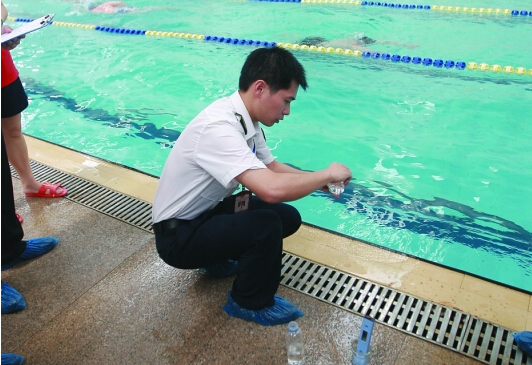 东莞市卫监所执法人员现场检测泳池水质。肖佩佩/摄