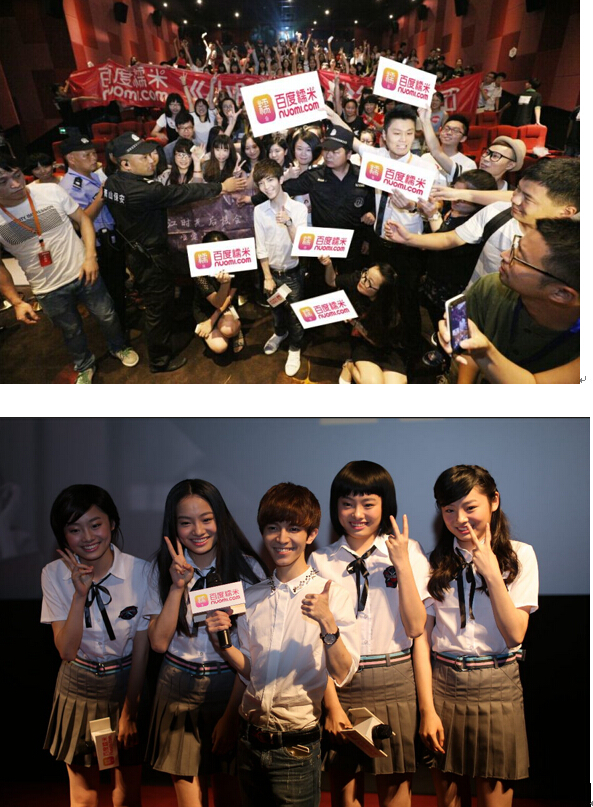 在718暑期大趴活动中,百度糯米电影也渗透到影片发行环节,与《小时代4》进行创新合作。通过对《小时代》粉丝的深刻洞察,百度糯米设置#一起zuo的姐妹花#话题,在百度贴吧和新浪微博发起了“晒姐妹照赢与郭敬明看电影”的线上活动,吸引了3500万+粉丝的关注,有意思的是,拥有“南京四小凤”之称的四胞胎姐妹在现场COS了小时代四姐妹的经典造型,大胆“表白”郭敬明,还各自演绎了一段自己最喜欢的小时代台词,将百度糯米电影粉丝与郭敬明一起看电影的活动推向高潮。