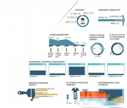此次问卷调查结果显示,近一半的受访者认为,随着O2O模式的崛起,与传统家装相比,这种新模式最大的优势是选择性更多,价格上因省掉中间渠道变得便宜,作为业主也会更加省心省力。但同时他们也在担心,一旦采用这种新的模式,线上线下是否能够协调一致,施工的安全可靠性以及设计图纸比较大众,会缺少个性化。(来源:南方网)