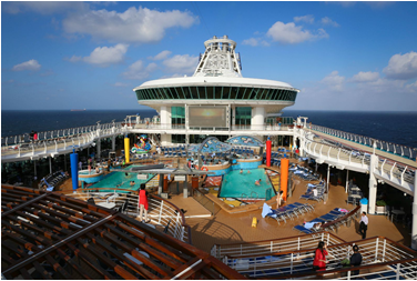 皇家加勒比航行者号的甲板主要分为A和B两大块区域,A区域的游泳池和成片的露天躺椅可以让你如在海滩边游玩一样。此外还有人在舞台上唱歌表演。在这里欣赏日出日落,享受海风吹拂而来是最好不过了。而且随着邮轮驶入不同的海域,你看到的风景也是不同的,这些风景完全纯天然,比在陆地上看到的景色多了一份让人沉浸其中的美。