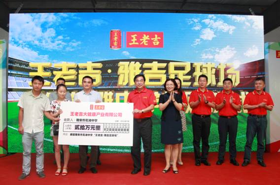 早在今年4月份,王老吉大健康产业(雅安)生产基地一期全面量产,同日宣布启动了雅安造王老吉凉茶“买一罐,捐一分”公益行动。消费者每买一罐雅安工厂2015年生产的王老吉红罐凉茶,王老吉就捐出一分钱。资金将用于“王老吉.雅吉校园足球希望工程”,建造以“王老吉.雅吉足球场”命名的足球场,资助贫困地区的校园足球场基础设施建设以及培训体育教师、足球教师等。