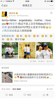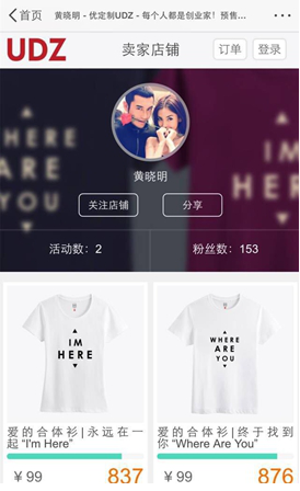这不是上次你和Baby在@优定制设计的情侣衫吗,怎么变亲子衫啦。” 原来,这是黄晓明和Angelababy一起在一家叫优定制的预售电商平台,预售的一款T恤——称为【爱的合体衫】。这两款T恤分别写着“Where are you”与“I’m here”的对话。此前,晓明被记者拍到在丹东拜佛,穿着此款T恤上了两大媒体的娱乐头条。