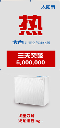 太阳雨大白儿童空气净化器自7月27日登陆淘宝众筹平台,受到热烈追捧,首日突破200万,3天时间突破500万。大白儿童空气净化器是全球全球最大的新能源企业太阳雨集团产品团队经过1年多时间的市场调研与技术突破,打造的一款为孕婴、儿童设计的空气专属净化器。