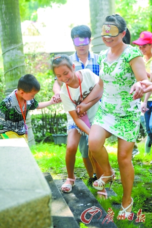 在昨日的活动现场,主办方设计了亲子互动游戏。游戏中有一个环节是,父母和孩子先后蒙上眼睛,由另一方牵着手下楼、行走。