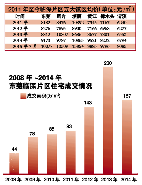 进入2015年,临深片区楼市持续火热,凤岗、塘厦出现缺货,库存紧张,在地价上涨、供应短缺、深圳客又大举进入东莞市场的情况下,凤岗、塘厦等临深片区房价上涨预期明显。与去年成交均价来对比,除了黄江房价下降外,半年时间内临深片区其他四镇区7月均价都上浮了2000~4000元/平方米;尤其是凤岗镇,2014年均价仅9787元/平方米,今年7月,均价已经上涨至13509元/平方米。