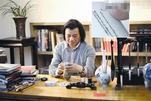 据悉,王芝文创作时仅以肉眼裸视,用特制毛笔在瓷器釉面上书写作画,再烧制。字体小至在每平方厘米的瓷面上书写50多个繁体汉字。作品字画结合,笔法流畅,彩工精致,独具匠心,是集书法、绘画、古典文学和陶瓷于一体的艺术。