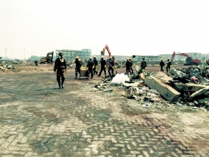 何树山介绍了危化品现场处置最新进展。危化品氰化钠散落点一部分是外围、一部分是核心区。核心区面积大约是10万平方米,已经用土或者沙石进行围堰、封闭。这几天重点对散落在外围的危化品进行清理搜寻,主要对离核心爆炸点一公里半径范围内、两公里半径范围内、三公里半径范围内3个区域进行清理搜寻。目前,一公里半径内、两公里半径内已经搜寻完毕,8月17日傍晚可以把三公里半径内危化品全部收集完。核心区内,散落在地面上的氰化钠已经全部清理完,8月17日开始对集装箱内存有的剧毒化学品进行清理。