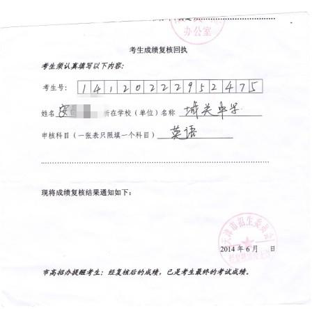 6月27日上午,考生收到盖有“经复核成绩无误”章的分数复核回执,然而让家长感到疑虑的是复核回执上并没有各科的成绩,只有七个字“经复核成绩无误”,甚至连日期都没有?难道复核分数本就没有各科成绩吗?依照规定,复核回执应该向考生提供所查学科单科成绩的分数,复核回执单竟是这么简单?这么草率?家长带着满心的疑虑和孩子回家了。