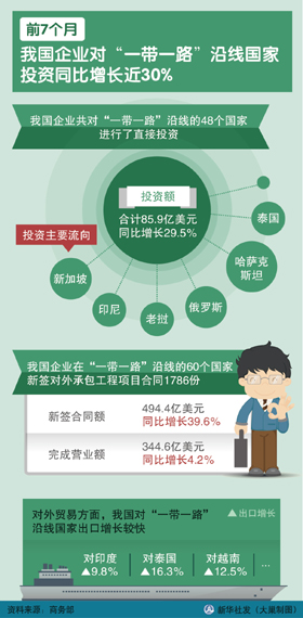 前七个月,我国企业共对“一带一路”沿线的48个国家进行了直接投资,投资额合计85.9亿美元,同比增长29.5%,投资主要流向新加坡、印尼、老挝、俄罗斯、哈萨克斯坦、泰国等。