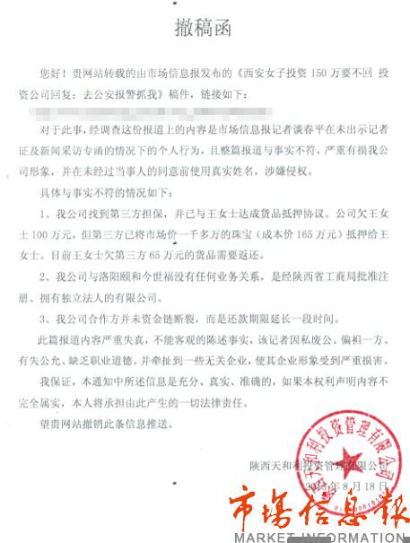 8月16日本报报道了西安一国企上班的王女士投资了150万要不回,担忧众多投资者血本无归,陕西天和利投资管理有限公司回复:可以去公安报警抓我一文后,然而众多转载网站却收到了陕西天和利投资管理有限公司的撤稿函,撤稿函中指出报道不实,是记者的个人行为,电话中一直要求见面,向本报记者阐述他的事实。