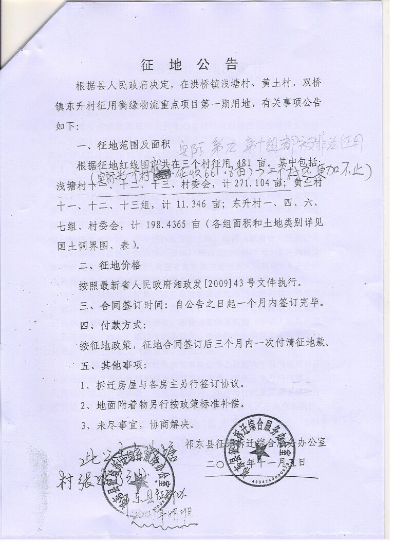 1、省政府批文日期为2011年11月22日,但祁东县拆迁办征地公告日期为2011年11月5日,比批文早17日。省政府批文总建设用地为481亩,其中耕地为60亩,无宅基地。而实际上仅浅塘村五个组的耕地就被征收了600多亩,浅塘村实际征用地超过2000亩,文件显示只征收3个组及村委会土地,有资料显示,实际上征收了5个组及村委会。他们只是把省政府的批文作为一个征地的幌子,明目张胆地圈地,请问他们的批文在哪里?他们的做法跟旧社会恶霸抢农民的土地有何区别,难道他们的所作所为不违法,天理何在!