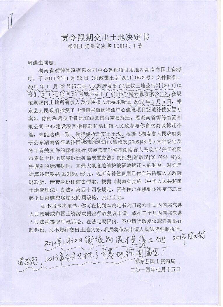 8、国土局竞投招标造假:程序上造假和面积上造假,从文件上的日期和土地面积内容可看出欺骗国家,采用各种手段违反《土地管理法》第四十五条规定,征收水田近2000亩违反国家有关宅基地征地拆迁的有关规定。衡缘物流企业是私人企业,只是省重点项目,非国家重点项目,也不是公共事业项目,更不是旧城改造项目,不符合政策征收宅基地范围,政府敢于非法强拆,其目的是利用公权利为自己谋私利,为开发企业谋得用地争取到时间,争取到更大的利益。拆迁户要告,各部门都不会受理,上访上告无门,而且随时可抓去拘留,当群众质问强拆有何法律依据时,县法院审判长旷娟对着拆迁现场人员说:“我执行的是省高院的强拆决定,有问题我负责。”当群众要她出示省高院强拆文件时,她拿不出来无语了。拆迁办陈志强说:“你同意拆迁签字还能得到30几万的补偿款,否则强拆了你一分钱也没有了”、“你告我没用,我代表国家政府,你们告不赢的”,还说“你要先安置别想,大家都一样先拆房以后安置”。政府、法院、公安机关联合在一起,欺骗、恐吓、打压群众无所不用其极,无家可归的周满生被强拆后在哭,政府人员及企业老板、市人大代表何秋生在笑。还有3条村被强征土地房屋的村民在哭。