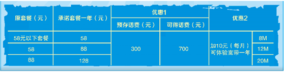 记者从东莞移动了解到:即日起,58元以下套餐和58/88元4G上网套餐客户,升级至 58/88/128元4G上网套餐并承诺使用一年,即可享受预存话费300得700元优惠;9月起,每月加10元还可以同时获赠8M/12M/20M移动宽带,可体验一年。