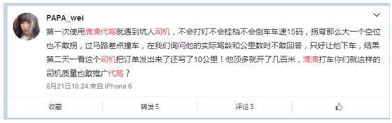 据了解,滴滴代驾上线时就宣布,不足一月有100万司机注册,当时震慑业界。但不足一个月,这一火箭速度就一再被证明是非常不靠谱。目前,全国各地每天都有车主投诉,滴滴代驾司机专业水平不行,有的素质差,带来的体验非常糟糕,甚至还发生很多因代驾不当的事故。