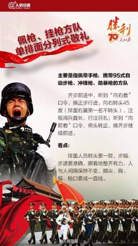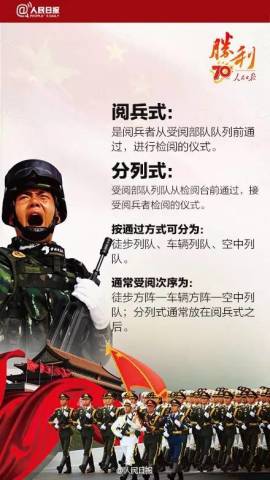 ①阅兵式:是阅兵者从受阅部队队列前通过,进行检阅的仪式。②分列式:受阅部队列队从检阅台前通过,接受阅兵者检阅的仪式。③分列式按通过方式通常有徒步列队、车辆列队、空中列队;④分列式通常在阅兵式后。更专业地看阅兵!