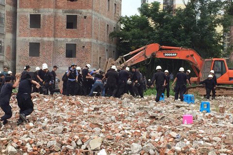 另有多段其他角度的视频显示,撞人前,奔驰车车胎已经破裂,在其越过警戒线,进入拆迁现场途中遭遇黑衣人员掷石攻击。事发后,现场被身穿警服的持棍民警封锁。